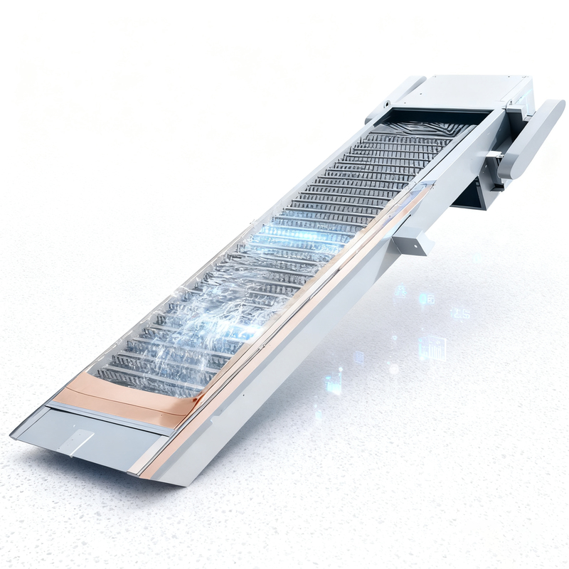 Quand la chaîne de dent est transportée au stimulant et au dos de l'équipement, dus au rôle de guidage de la roue de chaîne et du rail incurvé, les rangées parallèles de dent peuvent être disloquées, de sorte que la saleté solide puisse tomber dans la cannelure de scories par son propre poids. Quand elle tombe proprement, ce genre de grille est facile d'introduire la saleté dans le canal derrière la grille.